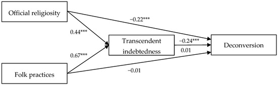 Transcendent indebtedness to God mediates the relationship between official religiosity/and folk practices and deconversion;