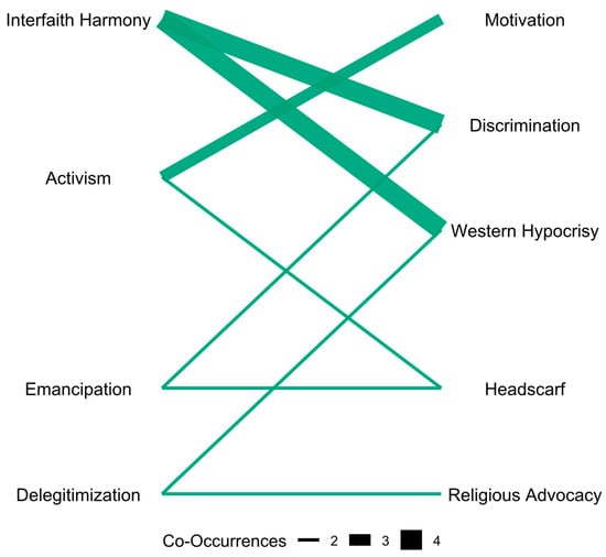 Another notable co-occurrence intersecting the religious advocacy topic are “victimization” and “gender” (4). This is evidence of a dual framing regarding Muslim women. It illustrates how Muslim women are portrayed by content creators, with one frame being political (“victimization”) and the other religious (“advocacy”), with the three intersecting in this case. This type of content works as a religious advice to Muslim women enduring victimization due to their intersectional identity. “Victimization” and “headscarf” also converge under “advocacy” once, highlighting this intersection of framings.