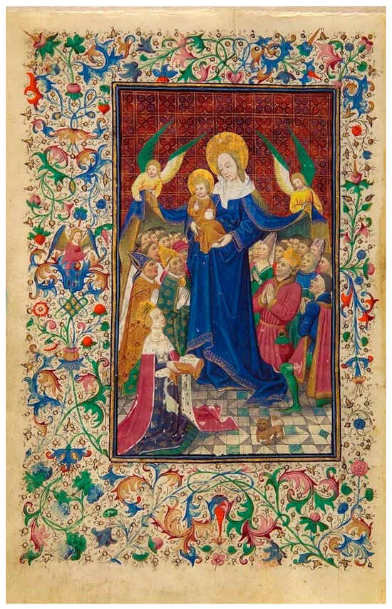 On folio 360v, there is a full-page miniature depicting the Virgin of Mercy. In this illustration, Mary, with the assistance of two angels, opens her mantle to offer protection and shelter to penitent sinners (Figure 2). To the right, the ecclesiastical realm is represented with prominent religious figures such as a bishop or cardinal and other Christian figures—some of whom are visibly tonsured. To the left, the courtly realm is shown, featuring a young prince in a cape and a king with a prominent crown. In the foreground, kneeling before the Virgin, is a young woman, identified as the owner of this Book of Hours. The figures of the monarchs clearly differentiate the youthful queen from the mature king (). This distinction appears intentional, reflecting the age difference between them—John II was 49 at the time of their marriage in 1447, while Juana Enriquez was only 22.