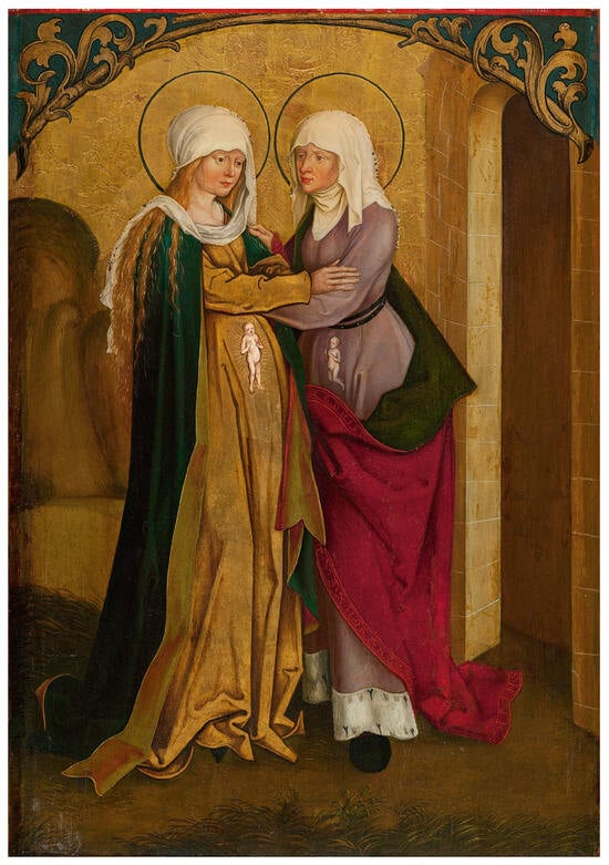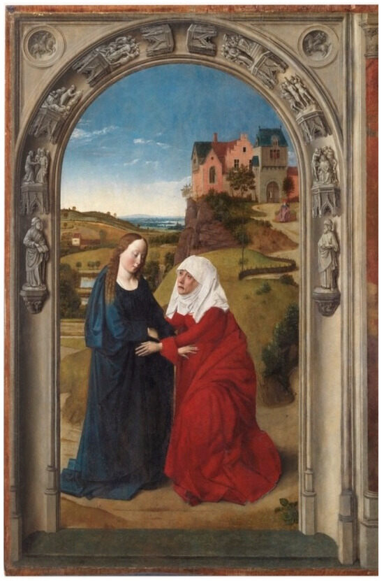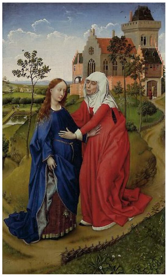 Of the four canonical evangelists, only Luke provides a detailed account of Mary’s genealogy and life. Among other passages, he describes her visit to her cousin Elizabeth, who was married to the priest Zechariah. Elizabeth and Zechariah were said to be “childless because Elizabeth was not able to conceive, and they were both very old” (Luke 1:7), but miraculously, she became pregnant with John the Baptist. Shortly after receiving the Annunciation from the Archangel Gabriel and learning that Elizabeth was pregnant, Mary decided to visit her cousin to assist during the final months of her pregnancy. The evangelist recounts it as follows (Luke 1:39–45) https://www.bible.com/bible/compare/LUK.1.39-49 (accessed on 1 September 2024):