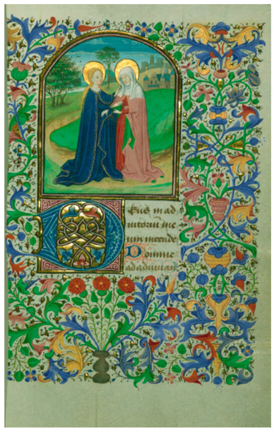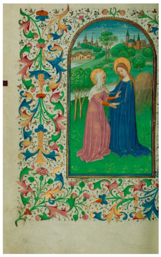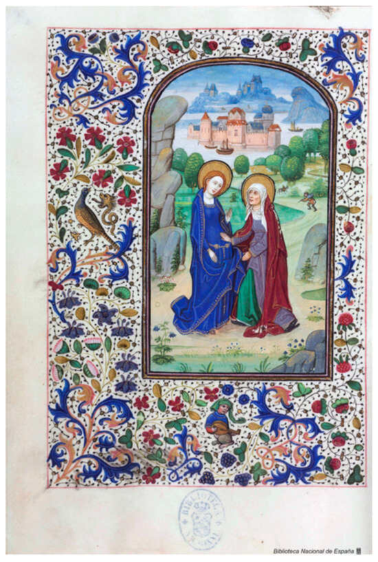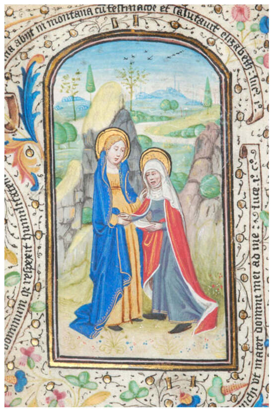 In the Book of Hours of Juana Enriquez, the miniature of the Visitation episode is located on folio 91v (Figure 6), between the Annunciation (folio 89v) and the Nativity (folio 93v). This placement confirms that it is part of a narrative cycle centered on both the Virgin and Jesus. Although the Visitation scene is well-represented in Western religious imagery, it was regularly found “in a clear narrative context, as part of a series of images rather than in an isolated form as a devotional image”. In addition, despite being established as a liturgical feast in 1389 and becoming a Marian celebration, it also served to reflect on both the Virgin’s purity and the humanity of Christ. Therefore, it was not unusual for the scene to appear in Marian and Christological cycles, with a greater prevalence in the former ().