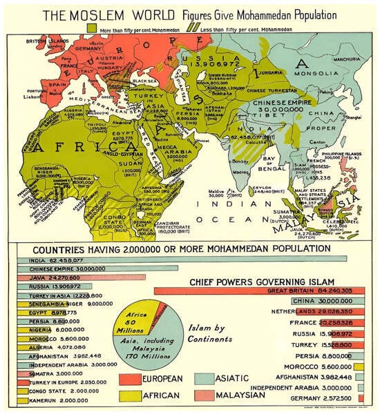 In giving cartographic coherence to “the Moslem world”—which is to say, in detailing the geographic and numerical scope of Islam as a singular unit—Zwemer contributed to the emergent association of “the Muslim World” as a race. As Cemil Ayden has argued, the very idea of “the Muslim world” was invented as a racial category that European empires increasingly used in the complex colonial relations of the 19th century to distinguish Muslims for differential treatment (Aydin 2017). It is crucial to note, here, that the racialization of Islam contained a much deeper genealogy in the white Christian supremacy of medieval and early modern Europe.14 Nevertheless, the association of Islam as a singular “world”—which is to say, as a civilizational unit (more on this shortly)—became a product not merely of the shifting racial epistemologies of the era, but also the changing political and economic contexts of 19th century European imperialism. For Aydin, Europe’s modern iteration of race became regularly applied to the idea of “the Muslim world”, especially during British and French imperialism in Asia and Africa, and the changing status of the Ottoman Empire at the turn of the 20th century.