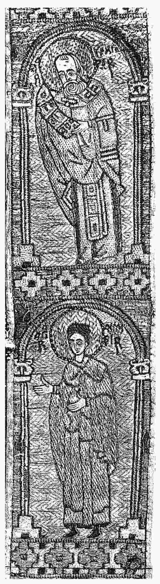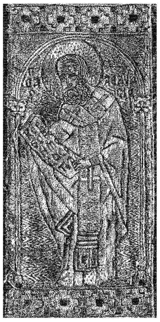The figures in our embroidery, which have glorioles around their heads and are placed in imaginary architecture, can be identified by the names embroidered above their heads. The inscription of the saints’ names also distinguishes them as icons. According to some authors, an icon becomes a true icon only through its inscription (