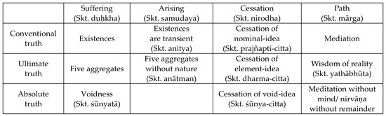 The following diagram shows the vertical axis from the conventional truth to absolute truth, representing this progressive mode. The horizontal axis also shows how the author conceives this treatise in terms of four truths (Skt. caturāryasatya) (Figure 1). To conclude, “nirvāṇa without remainder” is not just a possibility, but the inevitable consequence of this mode, a fact that cannot be ignored.