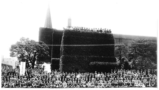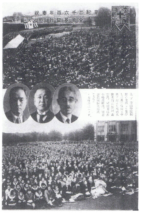 In addition to grand government-led commemorative ceremonies, various social groups held their own celebrations. On 17 October 1940, during the kannamesai 神嘗祭 (a Shinto festive resurrected after Meiji era), the Christian community in Japan held a “The All-Christians’ Conference, celebrating the 2600th Anniversary of the Founding of the Empire (Figure 1)” at Aoyama Gakuin University. In the initial plan of the conference’s publicity department, the goal was to attract 50,000 people. Not only Christians but also anyone agreeing with the convention’s purpose could participate, with eventually, approximately 20,000 believers and sympathizers from across the empire, colonies, and overseas attending (Miyakoda 1941, p. 29).