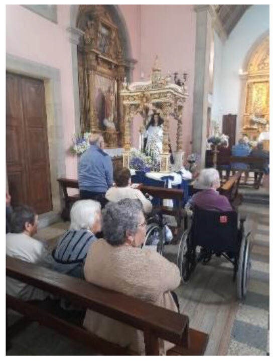 One of the most important moments of the festivities was the ceremony dedicated to the most vulnerable (Figure 5), which this year included the weakest members of the population (the elderly, those weakened by illness and those with some form of disability such as reduced mobility, blindness, cognitive impairment, etc.). Since the aim is to consecrate them to Our Lady of Antime to help them obtain graces and recover from their illnesses, one of the interviewees (E3) said that this year’s ceremonies had this innovation. This ritual shows the sensitivity of the organizing bodies in bringing activities to the most vulnerable, who in other situations end up being forgotten when planning an event.