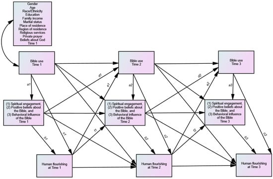 To address these issues, we focus on involvement with a central sacred text within the Christian tradition, the Bible, while controlling for other measures of religiosity. Specifically, we hypothesize that “Bible use”, various scripture-related behaviors—such as reading, listening to, praying with, and other ways of utilizing Bible text or content in any format and via any medium in a private or public setting ()—and individual well-being, conceptualized from a human flourishing perspective (), are positively related. We also hypothesize that the relationship between Bible use and human flourishing is explained partly by three likely outcomes of Bible use: spiritual engagement, positive beliefs about the Bible, and the behavioral influence of the Bible. Finally, these relationships are hypothesized to be reciprocal over time.
