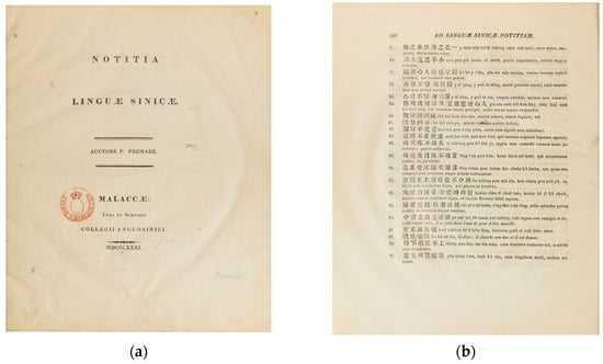 In 1831, the French Jesuit Joseph de Prémare’s Notitia Linguae Sinicae (Prémare 1831) was published in Malacca by the Anglo-Chinese College. In fact, this work had been completed as early as 1728, but due to various delays (Z. Li 2014, pp. 53–68), it was not published until a century later. Written in Latin with Chinese examples, the book is a significant early Western study of Chinese grammar. It also serves as a compilation of Western scholars’ knowledge of the Chinese language and literature at the time. The book is divided into two main parts: vernacular Chinese and classical Chinese. The French Sinologist Jean-Pierre Abel-Rémusat (1788–1832) (Rémusat 1857, preface, pp. ix–x) described it as the best work on Chinese studies by Europeans to date and noted that it was the only one to clearly distinguish between the two Chinese styles, which all other grammarians had confused. Multiple versions of this book exist, and the version referred to in this paper is the 1831 edition published in Malacca.