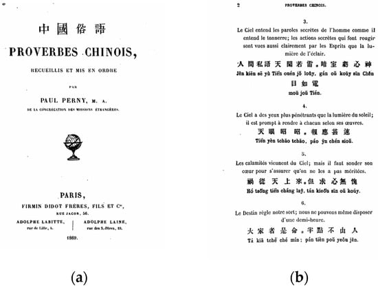 (a) The cover of Paul Perny’s Proverbes Chinois; (b) a sample page of Proverbes Chinois. Source: gallica.bnf.fr/Bibliothèque nationale de France, département Littérature et art, Z-57385. https://gallica.bnf.fr/ark:/12148/bpt6k57497215 (accessed on 19 October 2024).