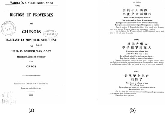 (a) The cover of Joseph Van Oost’s Dictons et proverbes des Chinois habitant la Mongolie Sud-ouest; (b) a sample page of Dictons et proverbes des Chinois habitant la Mongolie Sud-ouest. Source: gallica.bnf.fr/Bibliothèque nationale de France, département Philosophie, histoire, sciences de l’homme, 8-O2N-1266 (50). https://gallica.bnf.fr/ark:/12148/bpt6k5436616k (accessed on 19 October 2024).