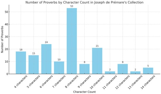 In Joseph de Prémare’s collection of proverbs, 165 entries are listed, but the 8th entry includes a variant of the proverb, bringing the actual total to 166 proverbs. We conducted a character count of the 166 proverbs (Figure 4).