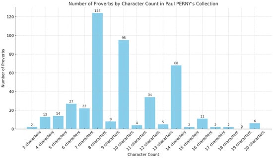 Paul Perny’s collection of Chinese proverbs includes 441 numbered entries, with the 226th entry containing a proverb and its variant. Additionally, three proverbs are listed twice: “Tigers and deer do not roam together” (虎鹿不同游), “When the eye twitches, regret follows” (眼睛跳,晦氣到), and “When one person rebels, nine families are executed” (一人造反,九族遭誅). Therefore, the collection contains a total of 439 distinct Chinese proverbs. The character count for each proverb in Perny’s collection is summarized in the table below (Figure 5).