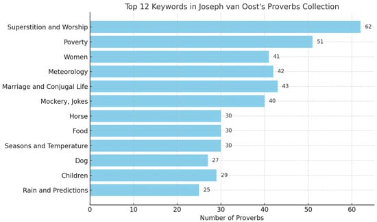 In terms of content, Joseph Van Oost did not organize the proverbs in his collection into categories, but as mentioned earlier, he provided 129 keywords in the appendix to help readers index the proverbs by theme. Below, we highlight the 12 keywords associated with the largest number of proverbs (Figure 7).