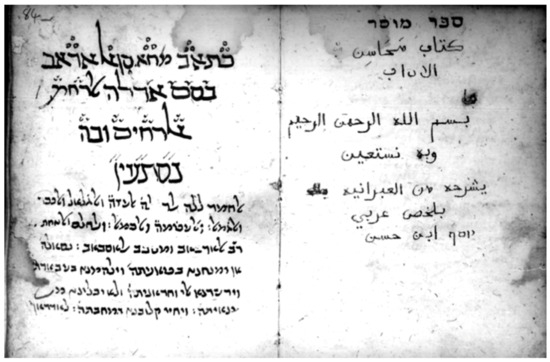 The interaction among Muslims, Christians, and Jews in the East was characterized by a shared intellectual culture in which these communities were well-versed in each other’s texts and traditions (Reif 2002, pp. 127–28; Luṭf 2019, pp. 21–26). Arabic served as a lingua franca and a medium through which Jewish and Christian communities engaged with their Muslim counterparts. Unlike Muslims, who adhered to the literary standard of al-ʿarabiyya derived from the language of the Qurʾān, Jews and Christians exercised greater linguistic flexibility. Jews thus frequently used Judaeo-Arabic in their daily lives, a practice that reflected their intention to preserve their linguistic identity while fostering a shared sociolect that enhanced solidarity within their social framework (Wagner 2010, pp. 4–8).
