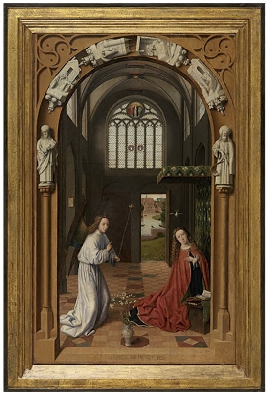 - Robb, David M. 1936. The Iconography of the Annunciation in the Fourteenth and Fifteenth Centuries. Art Bulletin 18: 480–526. [Google Scholar]