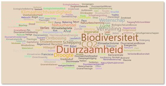 The word cloud illustrates the frequency of religious vocabulary used by 44 environmental organizations in 2023. Key concepts such as “Duurzaamheid” (Sustainability), “Biodiversiteit” (Biodiversity), and “CO2” are the most prominent, reflecting the primary concerns of these groups.