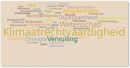 The word cloud from XR Nederland’s climate activism, as shown in Figure 6, reveals a strong focus on terms such as ‘Klimaatrechtvaardigheid’ (Climate Justice), ‘Duurzaamheid’ (Sustainability), and ‘Wetenschap’ (Science). ‘Climate Justice’ stands out as a central theme, reflecting the movement’s commitment to addressing the social and ethical dimensions of climate change, while ‘Sustainability’ highlights the broader concern for long-term ecological balance. The presence of ‘Science’ underscores XR’s reliance on scientific evidence, yet it is clear that these scientific arguments are framed within a moral and justice-oriented narrative, blending rationality with ethical concerns.
