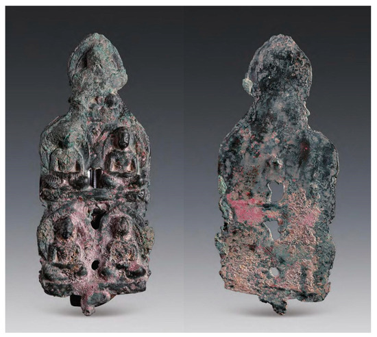 The Palace Museum also has a similar flat multi-Buddha statuette in its collection, consisting of two identical meditating Buddha statuettes and one flying apsara statuette. It is catalogued as Statuette No. 6 in Chinese Gilt Bronze Buddha Statues (Li 1995, p. 24) (Figure 16). The entire statuette is 6.7 cm tall, with each meditating Buddha statuette about 4.9 cm tall, matching the size of the previously mentioned multi-Buddha statuettes. Moreover, the features of each part of the Buddha figures, the shape of the halo, and the decorative patterns closely resemble those on the two previously discussed statuettes. The band-like beaded patterns decorating the halo of these Buddha figures are a prevalent decorative motif in the gilt bronze Buddhist statuettes of the Guanlong region and are rarely found on small gilt bronze Buddha statuettes from elsewhere (Zhang and Wei, forthcoming). This statuette was purchased in Xi’an, and it is highly probable that it also originates from the Guanzhong region, where Xi’an is located. The three flat multi-Buddha statuettes referenced above can be classified as the same type of Buddha statuette; they were manufactured and popularized in close proximity and are likely of a similar age.