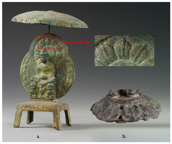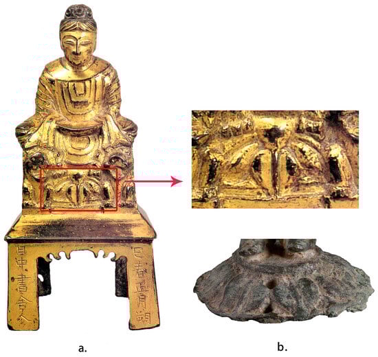 In China, it is not unusual to find lotus petals styled as Bodhi leaves on small gilt bronze Buddha figures. The Palace Museum houses a small gilt bronze standing statuette of Maitreya Bodhisattva with a lotus throne, with a total height of 9.9 cm. This statuette was purchased in Xi’an in the early 1960s and is cataloged as image No. 21 in Chinese Gilt Bronze Buddha Statues 《中國金銅佛》 (Li 1995, pp. 40, 229) (Figure 5a). The lotus petals on the throne of this statuette also take the form of Bodhi leaves, almost identical to those on the lotus throne of the standing Buddha from Chengren Village (Figure 5).