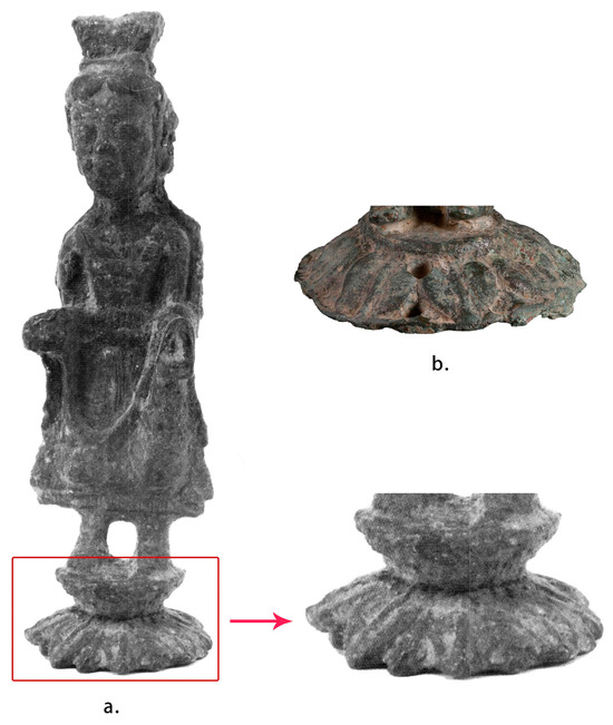 Comparative illustration of the lotus pedestal of the standing Buddha from Chengren Village and the Buddha statuette from the second year of the Shengguang era ((a). the Buddha statuette from the second year of the Shengguang era, taken from Luo 2010, p. 40; (b). the lotus pedestal of the standing Buddha statuette from Chengren Village. Graphic created by the author).