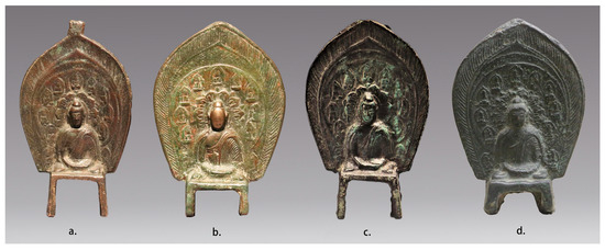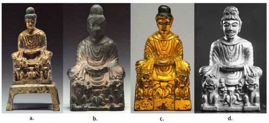 The same Bodhi leaf-shaped lotus petals also appear in numerous early small gilt bronze Buddha statuettes found outside the Guanlong region in China, such as those excavated in Xiguancheng, Yi County, and Hebei 河北易縣西貫城 (Figure 7a), as well as those collected in the Zhengzhou Museum 鄭州博物館 (Figure 7b), the National Palace Museum, Taipei (Figure 7c), the Nelson Atkins Museum in the United States (Figure 7d), and the Idemitsu Museum of Arts in Japan. Each of these statuettes also cast the same Bodhi leaf-shaped lotus petal at the center of the double-lion pedestal. Moreover, these Buddha statuettes are highly consistent in terms of posture, robe style, clothing patterns, sleeve flares, tenons, and the form of the two lions, indicating that they belong to the same phase of the evolutionary sequence of early small meditative gilt bronze Buddha statuettes in China (Zhang 2024, pp. 49–58). Taking the second year of the Shengguang era of Daxia as a chronological reference, it becomes evident that this Bodhi leaf-shaped lotus petal pattern was a common and popular design on small gilt bronze Buddha statuettes in the late Period of the Sixteen Kingdoms across the Guanlong region and even the entirety of northern China.