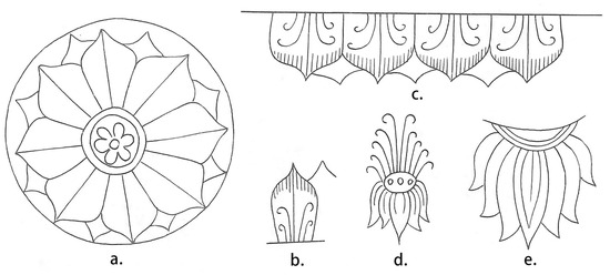Illustration of the petal pattern on Buddha statuette No. 2 unearthed in Beisong Village, Shijiazhuang ((a). Lotus petal on the canopy; (b). Lotus petals on the backdrop; (c). Lotus petals above the disciple statuette; (d). Lotus petals located at the center of the Double Lion Throne. (e). Lotus petals on the front of the Buddha’s pedestal. All taken from Liu 2002).