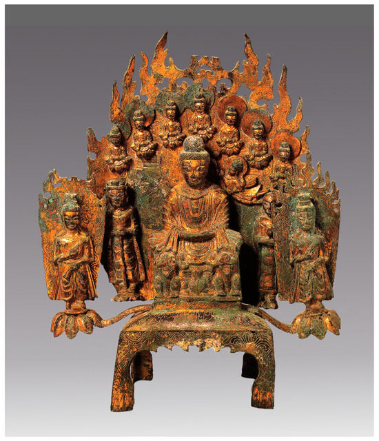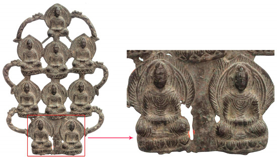 In fact, there are also some Buddha statuettes within the Guanlong region that share the same style as the Buddha figures on the flat five-Buddha statuette. Among them, the Lingtai County Museum 靈臺縣博物館 houses a well-preserved flat nine-Buddha statuette (Wei 2018, p. 1436), where each figure is strikingly similar in appearance (Figure 15) and highly consistent with the images of the Buddha figures on the flat five-Buddha statuette excavated from M3015 in Chengren Village. It is important to note that this consistency is not limited to individual elements, but extends across all aspects of the statuettes. A number of elements display a high degree of similarity, from the facial features and postures of the Buddha figures to the clothing patterns on their arms, the shape and texture of the sleeve cuffs, the detailed representation of the hand mudras, the shape of the halo, the position and form of the band-like joint bead patterns and parallel radiating flame patterns on the halo, and even the shape of the lotus petals on the pedestals.