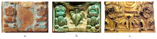 Next, we will discuss the dating of this type of flat multi-Buddha statuette. Chinese Gilt Bronze Buddha Statues suggests that the flat two-Buddha statuette dates to the first half of the fifth century, but does not give a detailed explanation (Li 1995, p. 24). There is also a very special type of plate-shaped Buddha statuette prevalent in the Guanlong region that can offer relatively reliable evidence for use in dating flat multi-Buddha statuettes. There are a total of five extant plate-shaped Buddha statuettes, four of which are dated. In 1980, a gilt bronze plate-shaped Buddha statuette made by the monks of the Zhuiyuan Temple 追遠寺 in the seventh year of the Taihe era 太和七年 (483 AD) was excavated in the Lianhu District in Xi’an City 西安市蓮湖區. It is generally believed that these statuettes were popular in the Shaanxi and Gansu regions (Li 2016, p. 27; Zhang 2016, p. 261). An undated plate-shaped Buddha statuette collected in Japan has two seated Buddha figures cast on its upper edge that closely resemble those on the flat multi-Buddha statuettes (Jin 2002, p. 399) (Figure 19a). The bottom of this statuette and the pedestal are connected by two complete “C”-shaped twin-dragon head knobs; a similar medallion connection joint can also be found on another plate-shaped Buddha statuette dated to the fourth year of the Yanxing era in the Northern Wei Dynasty 北魏延興四年 (474). Similarly, the Buddha figures on both sides of the flat nine-Buddha statuette from Lingtai County are also connected by a comparable “C”-shaped twin-dragon head knob (Figure 19b). Furthermore, a similar “C”-shaped twin-dragon head image also appears on a copper knocker ring unearthed from a painted coffin tomb from the early Taihe era of the Northern Wei Dynasty in Leizumiao Village, Guyuan 固原雷祖廟村5. The detailed features of the dragons, such as the mouth, the eyes, the ears, the mane under the ears, and even the incised lines and bead patterns on the body, are almost identical. This can serve as additional evidence for use in dating the nine-Buddha statuette from Lingtai.