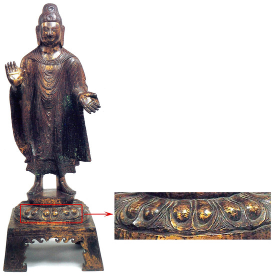 - Zhai, Chunling 翟春玲. 2003. Xi’an chutu beiwei tongfo zaoxiang yanjiu 西安出土北魏銅佛造像研究 [Research on the Bronze Buddha Statues of Northern Wei Dynasty Unearthed from Xi’an]. Wenbo 文博 5: 46–47. [Google Scholar]