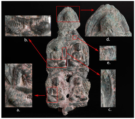 Details of the flat five-Buddha statuette ((a). the right arm of the lower-right Buddha statuette, (b). the sleeve cuff of the Buddha statuette in the second row on the right, (c). the left side of the halo of the Buddha statuette in the second row on the right, (d). the right side of the halo of the uppermost Buddha statuette, (e). a petal pattern on the pedestal of the uppermost Buddha statuette, graphic created by the author).