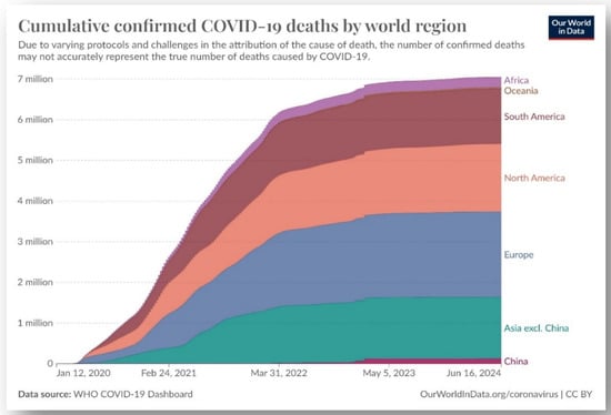 - Our World in Data. 2021. Cumulative confirmed COVID-19 deaths. July 16. Available online: https://ourworldindata.org/grapher/cumulative-covid-deaths-region (accessed on 5 June 2024).