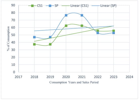 The results above show three variables (ABC). Firstly, Variable A—Consumption/Sales Period—consists of the Consumption Year (CY), Consumers1 (CS1), and Sales Period (SP), which are presented. The results revealed that consumption was low and aligned with sales in the pre-COVID era, dramatically increased during COVID-19 and took a new normal in the post-COVID period, as evident in Figure 4 below. While the new normal position of BK sales became lower than the COVID-19 period, the linear regression shows it was considerably higher than the pre-COVID consumption and sales.