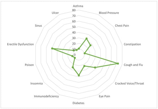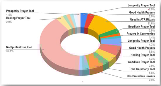 In Figure 7, participants assert they use BK for 15 medical conditions. Among them, 72% use BK in treating coughs and flu; 32% use it to control blood pressure; 26.7% use BK as a chest pain remedy, and 37.3% use the product in curing cracked voice and throat pains. All these are COVID-19-related ailments. In the quantitative summary in Table 1 and Table 2, most participants testified that BK has a spiritual power that translates into medical values. All the health conditions listed in the quantitative results in Figure 7 were equally attested to by the qualitative results in Table 3. Such homogeneity of results from respondents’ opinions hypothetically suggests that the spiritual knowledge of the participants influences their healthcare decisions.