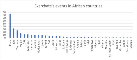 The exarchate’s events in African countries, registered on the official webpage https://exarchate-africa.ru/novosti/ (accessed on 8 December 2024), 1 January to 23 August 2024. Calculated by the author.