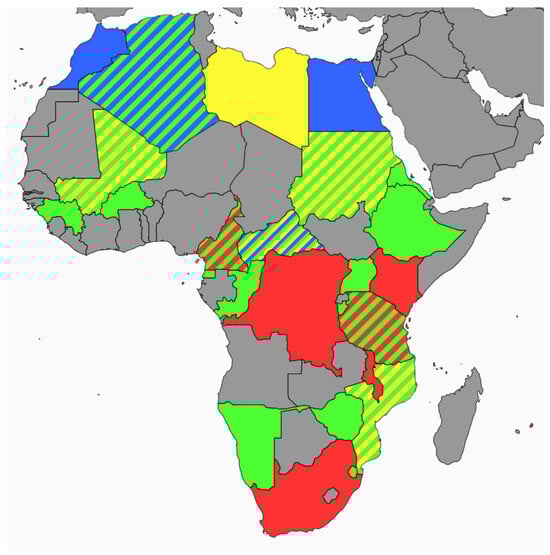 Figure 2 represents Russia’s presence in Africa in the religious, economic, political and military aspects. For this visualization, Russia’s presence in Africa was observed as follows: (i) seven countries in red with the greatest ROC’s presence, calculated according to Figure 1; (ii) four countries with the greatest trade turnover with Russia in blue (Barabanov et al. 2023); (iii) eighteen countries, which never supported UN resolutions against Russia in green; and (iv) five countries with the greatest Russian military presence in yellow (Mikhailenko 2024).