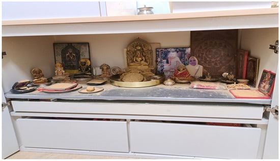 On 12 January 2024, I was on my way to visit a Ghar Derasar in East Singapore, located within the Tanamera Condominium complex. Upon arriving at the entrance of this household, a gau mata statue caught my eye before I stepped into the actual condo and the Ghar Derasar. This sight is no longer unfamiliar to me; during my research with the Jains in Southeast Asia, I have come to see the gau mata24 statue as a significant element in the complex tapestry of self-identification. It serves as a key to understanding their broader sense of “Indianness” that permeates their daily lives, even as Jains. The doorway stands as the initial point where they express a facet of their identity. In the internal part of the condo, next to the doorway along the corridor, there is an altar of the Jain Ghar Derasar, revealing the inner core of “Jainness” (See Figure 5).