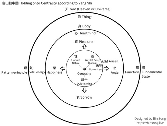 Another approach to understanding the significance of quiet-sitting meditation in Yang Shi’s general method of self-cultivation is to explore the temporal order in which external things shall be received by the heartmind. To do this, we need to examine his interpretation of another Ruist classic, the Zhong Yong (中庸, Centrality and Commonality). The Zhong Yong begins by stating that “Before the feelings of pleasure, anger, sorrow, and happiness are aroused, the state is called centrality (中). When these feelings are aroused and each and all attain their due measure, it is called harmony (和)”. (Chan 1963, 97, translation adapted). Furthermore, it emphasizes that the states of centrality and harmony are essential for humans to embark on the path of fulfilling their Tian-endowed good human nature and, ultimately, realizing the cosmic creativity of Tian in the human world.