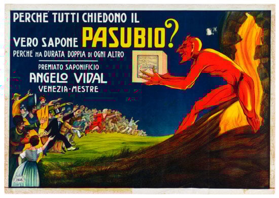 One point of interest is that, despite their not to be underestimated importance, there were, nonetheless, fewer posters featuring the devil as the “enemy” than those that instead attributed positive qualities. In these, the devil was represented as a “benevolent” figure who allowed the main qualities of the marketed products to be brought out or expressed. To give a few examples, this type of use can be seen, among others, in the poster for Canetta bitters and Gilson cognac, in which a fiery red devil emits a flame, placing the attention on the liquors’ high alcohol content. Instead, in the poster for Pasubio soap, the devil offers the products to the crowd, who eagerly run up to get it (see Figure 1).