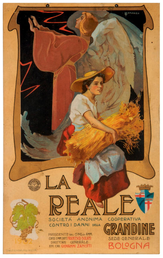 Angels were the main vehicle of these types of association, like the one used in the poster for “pasta angelica”, scattering packets of soup pasta from on high, and the angel in the “Vesti bene, vesti lana” poster, giving an elegant gentleman the precious advice to “dress well, wear wool”. Table 2 offers interesting details on this, highlighting the prevalence of this symbol in posters to promote services (44.4%), in particular, in insurance and mutual aid. One example is the poster for the La Reale joint-stock cooperative in Bologna, in which the image of an angel rises up to protect a peasant woman, giving the service being promoted the ability to protect the harvest from hailstone damage (see Figure 3).