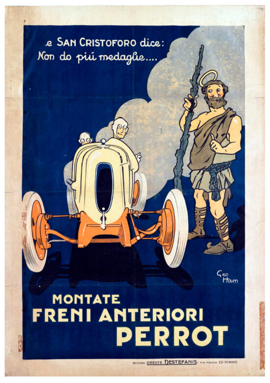Saints also convey protection, but in the form of health protection, relief from suffering and as a prevention tool (pillole di Sant’Antonio). A particular case is when the saint’s protection is taken away; in other words, it is no longer needed as it is ensured by the product or service. This is seen in the poster for Perrot brakes in which Saint Christopher, protector of car drivers, realizes that his medallions are no longer needed through the slogan “e San Cristoforo dice: Non do più medaglie…” (and Saint Christopher says: I don’t give medallions away anymore…) (see Figure 5).
