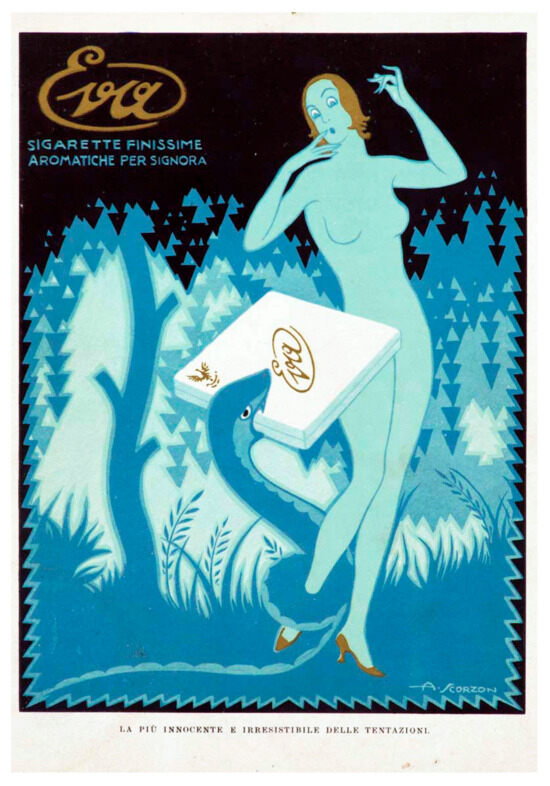 This happens, for example, in the poster for Eva ladies’ cigarettes (see Figure 6). Here, like the forbidden fruit, a snake offers the product to a woman who gives in to the “most innocent and irresistible of temptations”: not only the temptation to buy these cigarettes and smoke them in public, mainly the remit of men at the time, but also to become the tempter herself. The same dual message—let yourself be tempted and become tempters yourselves—is found in the poster for Candio champagne, which shows Adam and Eve drinking from the same glass held by a snake.