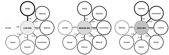 Flower plots of the most salient motivations for the performance of rituals broken down by socioeconomic status (SES) based on a tertile split. The outer circles represent the most salient items listed by that group, starting at the top and descending clockwise. The weighted border lines of these outer circles represent their relative salience, which is also indicated by the numbers.