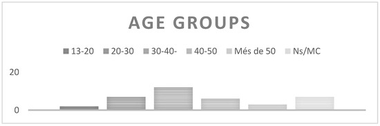 The women’s origins were diverse: eleven were born in Catalonia, six in Morocco, two in the Gambia, nine in Spain, five in Latin American countries, and the remaining four in various Mediterranean countries. Their ages were diverse, with representatives of several generations, the most numerous groups being middle-aged, consistently with belonging to an association and playing an active role in the group under study (Figure 1).