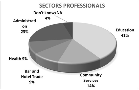 Regarding the employment status of the women, 60% worked with a contract (three civil servants and one self-employed professional), 16% were university students, 5.4% were unemployed, 2.7% were housewives, and 16.2% did not respond to this question. The sectors in which these women worked are shown below in Figure 3.