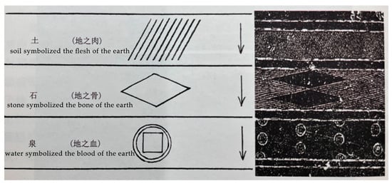 During the Warring States Period and the Han dynasty, some people called the space where the dead resided “Gloomy City (幽都)”. In Elegies of the South·Requiem (《楚辞·招魂》), Qu Yuan exclaimed, “Oh, soul, come back! Don’t go to the Gloomy City down below. (魂兮归来!君无下此幽都些。)”. Here, he is calling the ghosts of the dead back from “Gloomy City (幽都)”, which he decribes as “down below (下)”, indicating that the people of Chu also believed that the space for ghosts after death was underground. The original meaning of “gloomy (幽)” is deep and dark, and the periphery of the character “gloomy (幽)” is in the shape of a “mountain (山)”, thus referring to the space deep underground in Elegies of the South. In ancient Chinese, “city (都)” could refer to a large and important town or a unit for the control of the population, and the appearance of the name “Gloomy City (幽都)” suggests that people at that time already believed that the ghosts of the dead would gather in the underground world. The back wall of the Xiaotangshan Stone Shrine (Han dynasty) was found to have patterns in the underground space surrounded by diagonal lines, diamond shapes, and copper coins. According to Jiang (2016, pp. 78–86), the Han paintings depict the world after death, and the basic nature of the burial chamber is a space in “Gloomy City (幽都)”, with the patterns in the mural paintings symbolizing “soil (土)”, “stone (石)”, and “spring (泉)”, which represent a cross-section of the earth and reveal the underworld below the “Nine Springs (九泉)”, as shown in Figure 1.