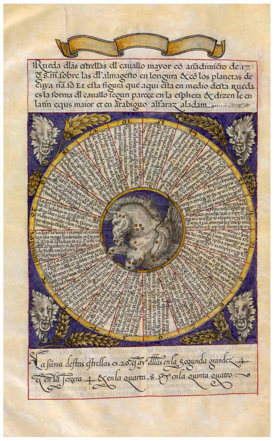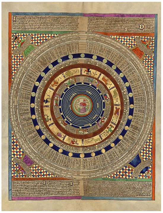 The first reason behind the preference for circular compositions addressed here is the most obvious of all: to represent visually the purported shape of the universe. This representation was subsequently refined and nuanced over the centuries in Babylonian, ancient Greek, and Roman cultures, before being adopted by Christian culture in the Middle Ages and, albeit still rooted in previous ethe, adapted to the new worldview. In the Catalan Atlas (1370–1380), the known world up to that point is represented. In the section with cosmography (Figure 2), a model is included that was repeated well into the 17th century, with concentric circles from the Earth to the four elements, the seven “planets” (including among them the Moon and the Sun), the wheel of the zodiac, plus the phases of the Moon, along with a multitude of other astronomical data.