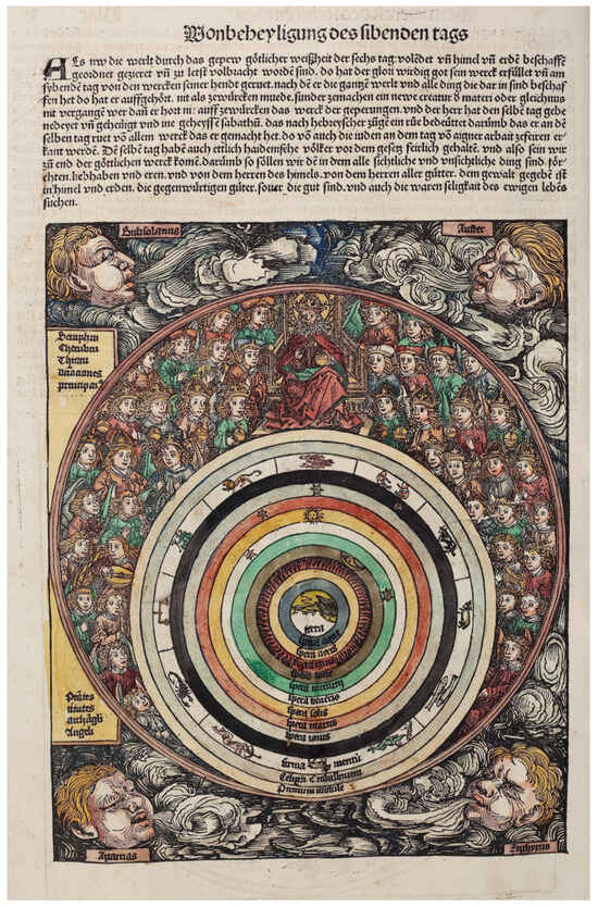 Furthermore, Christian thinkers and artists gave God a leading role in their depictions of the universe, adding an Empyrean conception beyond the physical spheres, with the Christian God and angels, as is the case of several medieval and early modern images. This model with the Empyrean surrounding the spheres is shown in one of the coloured copies of the Nuremberg Chronicle (1493) (Figure 4).