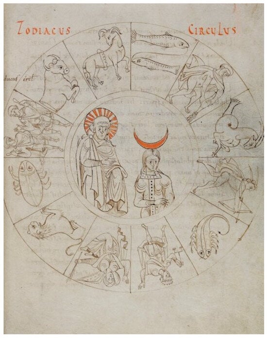 The way of representing the zodiac wheel was quite firmly established. The Revised Aratus latinus, appearing in an illuminated book (Figure 5) housed in the Abbey Library of St Gall (Ms. Sang. 250) (fourth quarter of the ninth century), includes a common illustration of the zodiac wheel—depicting Apollo-Helios and Diana-Selene in the centre—with the signs proceeding in counterclockwise direction. The order of the constellations on the ecliptic had a direct influence on the zodiac and, subsequently, on natal charts, with the 12 houses, beginning with the ascendent on the left side. Around that time there were representations with the same pagan iconographic type appearing, for instance, in Rabanus Maurus’s De originibus rerum (c. 825).