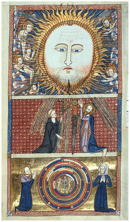 A miniature illustration in the Omne bonum is divided vertically into three sections, in the lowest of which there is a vision of the cosmic diagram with two donors, a layman and woman, contemplating it with expressions of devotion (Figure 6). They are praying for their souls in the physical realm, the sublunar world under the spheres. In the middle section, St Paul and St Benedict are interceding for them. Lastly, in the top section, there is a vision of God with a round face to highlight visually His perfection, as is contended here. The divine face of God shines for the angels, the saints, the donors of the piece, and the beholder (Camille 1996, p. 126; Alcoy 2017, pp. 91–92). As God has a perfect form, He has to be conceived as being circular. According to Cusa in his De ludo globi (1463), the true circle only exists as an ideal, for any material thing that appears to be truly round is not really so, for only God can possess perfect roundness20.
