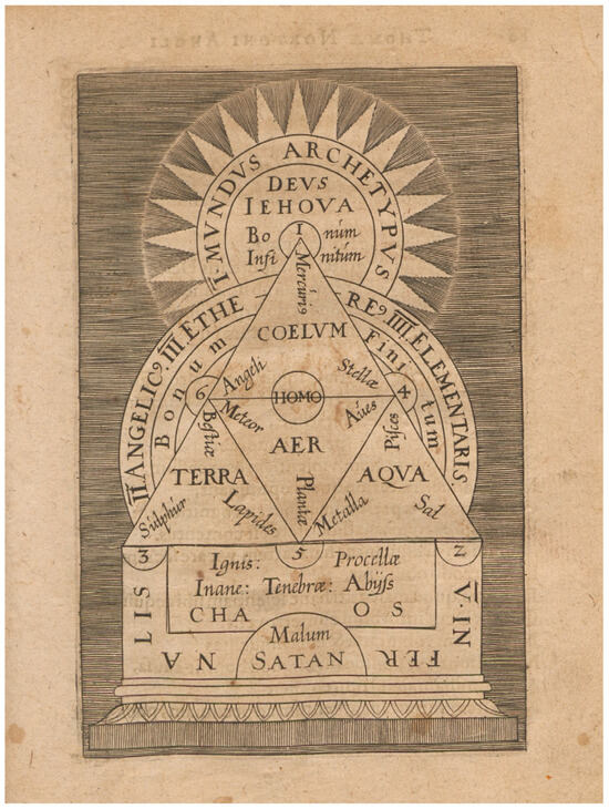 A traditional way of conceiving this Christian symbolism can be seen in an engraving from the alchemical treatise entitled Tripus aureus, hoc est, tres tractatus chymici selectissimi (Figure 9), whose 1677 edition includes an engraving featuring a radiant circle representing God, the circle as the world creation, made by Him, with angels of divine perfection, a triangle as the material world of the four elements (and the Tria prima of alchemy), and a rectangle below as the inferos, the world of evil, visually symbolised by a half sphere or Satan.